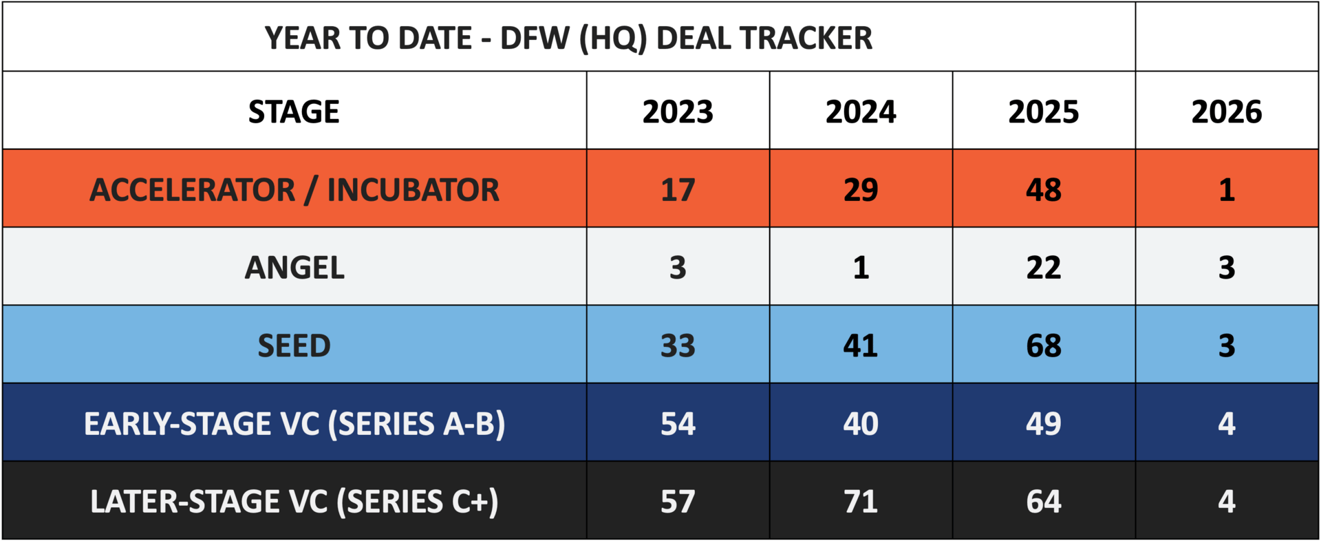 Welcome to the 31st edition of the Dallas Venture Deals newsletter. January opened the year at a more measured pace for the Dallas–Fort Worth venture ecosystem. Year-to-date, DFW-headquartered startups have recorded 15 deals totaling $84M, with activity spread across angel, seed, early-stage, and later-stage rounds. The mix points to a healthy pipeline forming early in the year, even if overall dollars are lighter than prior highs.